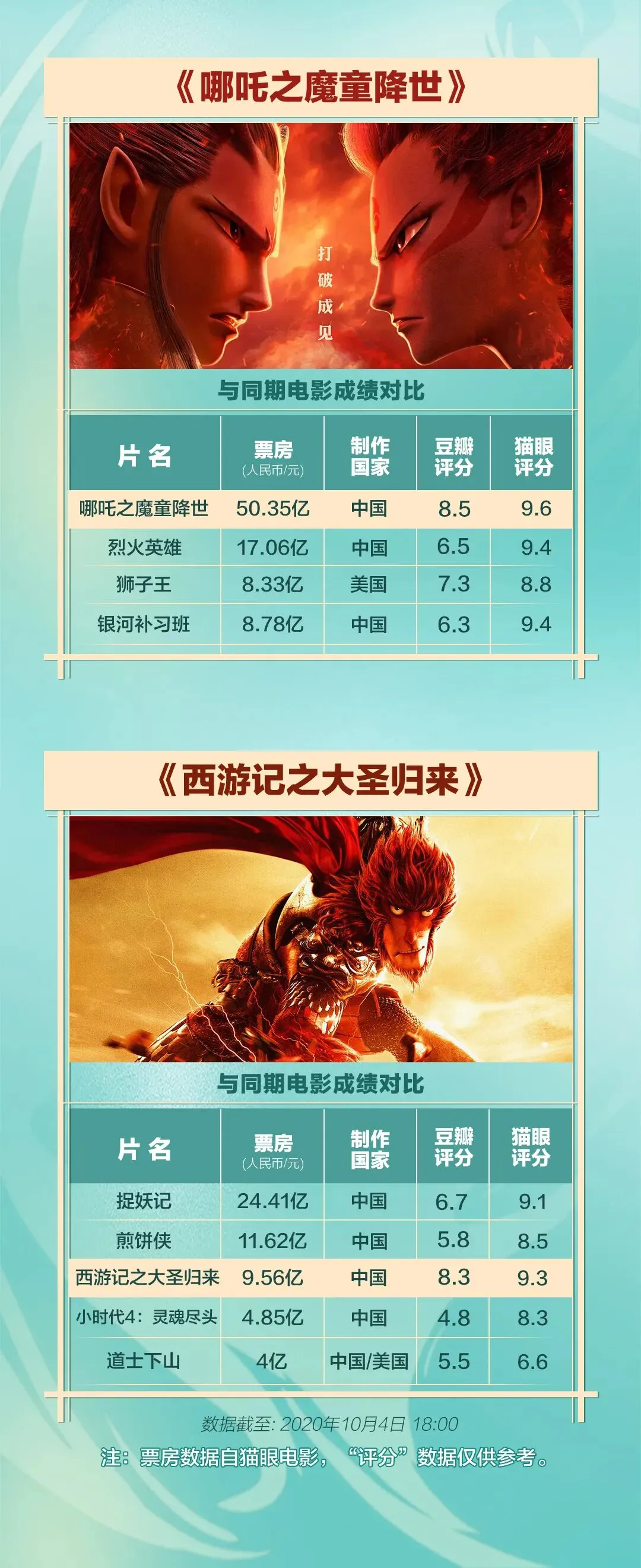 “十一”期间,动画电影《姜子牙》也正式上映。在不到4天的时间里,该片票房已经突破了10亿元人民币,在同期上映的电影中处于领先地位。《姜子牙》的剧情、制作技术等也成为网友们热议的话题。