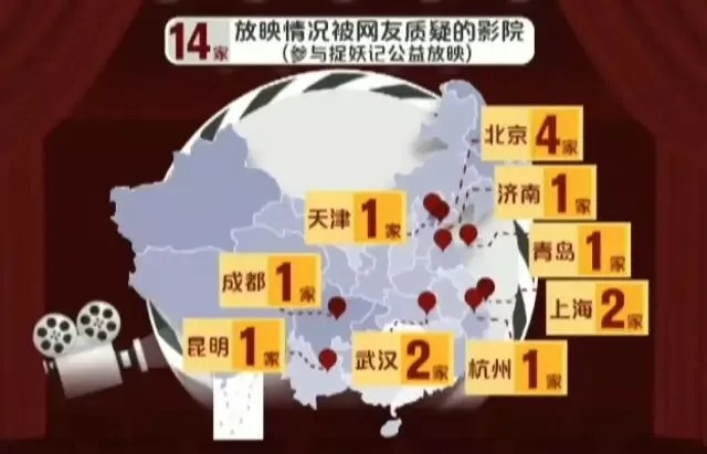 参与《捉妖记》公益放映的影院一共有29家,在我们搜集到的线索资料当中,有14家的放映情况被网友提出质疑。
