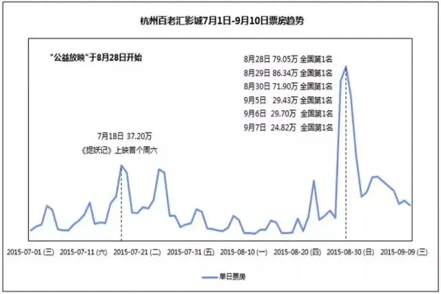 记者分别对参与公益放映的北京、杭州等地的多家影城进行了调查。杭州百老汇开业五年,从没进入过全国票房百强。但在这次《捉妖记》公益放映期间,它六次成为全国票房第一,第一次发生在2015年8月28号,当天《捉妖记》一部电影就贡献了72.48万元票房,其他7部影片一共6.59万元票房。