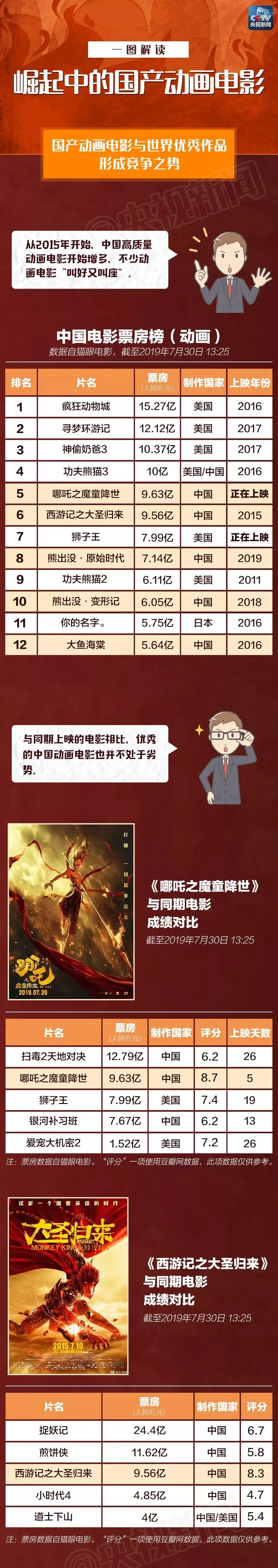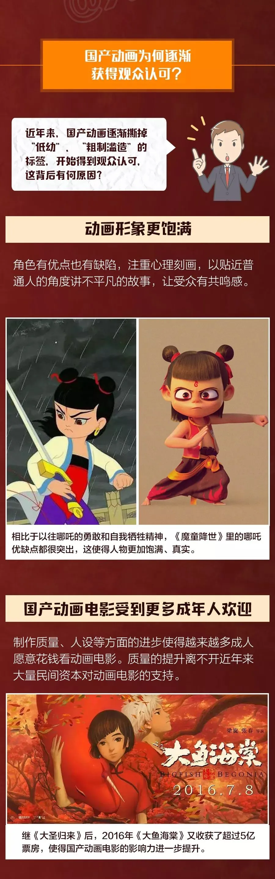《西游记之大圣归来》和《哪吒之魔童降世》这类国产动画电影为何能获得观众认可?国产动画电影近年来的成绩如何?中国动画电影在哪些方面仍有不足?一张长图,带你了解↓↓↓