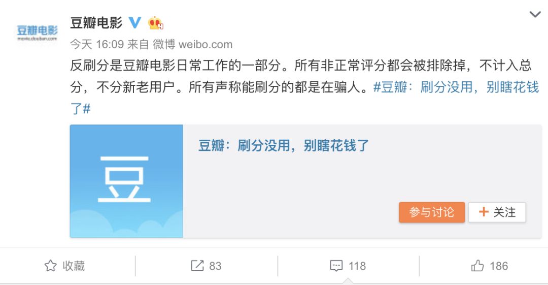 针对新片上映时5500元包刷6分的消息,豆瓣5月9日通过新浪微博 @豆瓣电影 进行了回应:反刷分是豆瓣电影日常工作的一部分。所有非正常评分都会被排除掉,不计入总分,不分新老用户。所有声称刷分的都是在骗人。