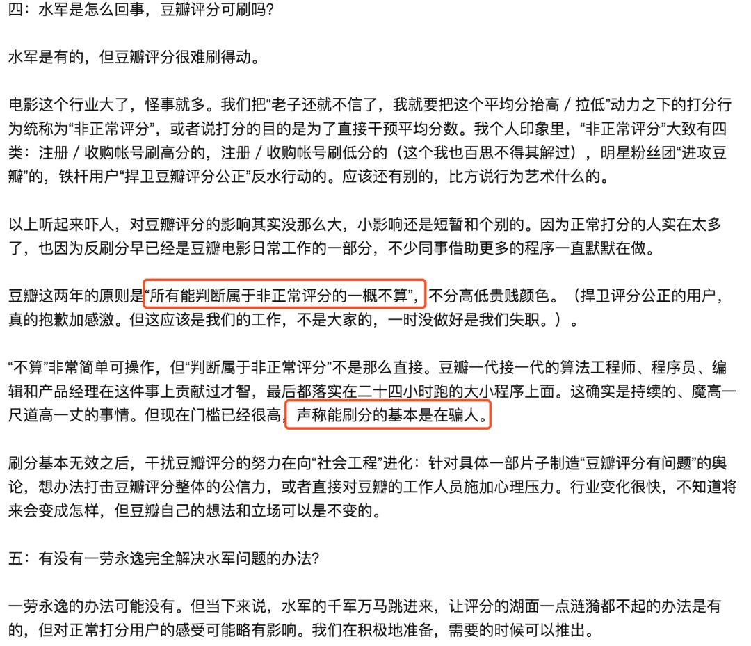文章中,第四问和第五问已经对刷分和水军行为表达了自己的态度:“所有能判断属于非正常评分的一概不算,能刷分的基本都是骗人的。”“解决水军问题可能没有一劳永逸的办法,但在积极准备,需要的时候可以推出。”