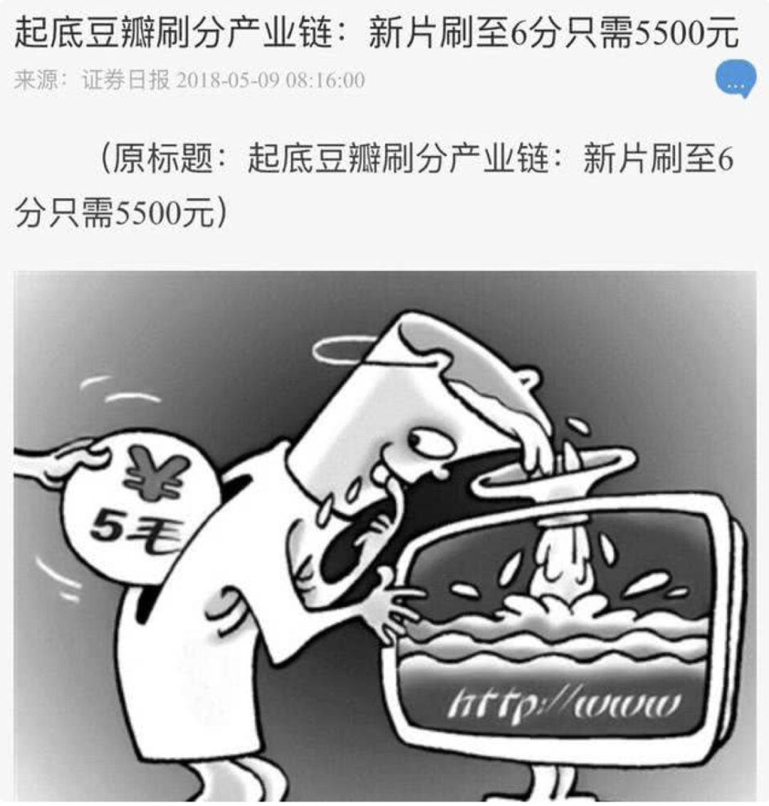 最近,一篇名为《起底豆瓣刷分产业链:新片刷至6分只需5500元》的文章引发关注。随后,豆瓣回应了……相信很多影迷、观众、电影爱好者会把豆瓣电影的评分,作为自己选择观影的“标准参考系”,尤其是在选择观看最新影片的时候,豆瓣评分显得很重要。但就在5月9日,证券日报的一篇题为《起底豆瓣刷分产业链:新片刷至6分只需5500元》的文章,让网友们炸了锅↓