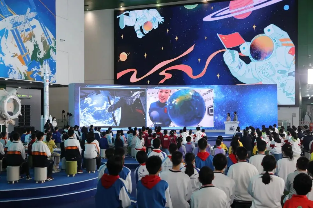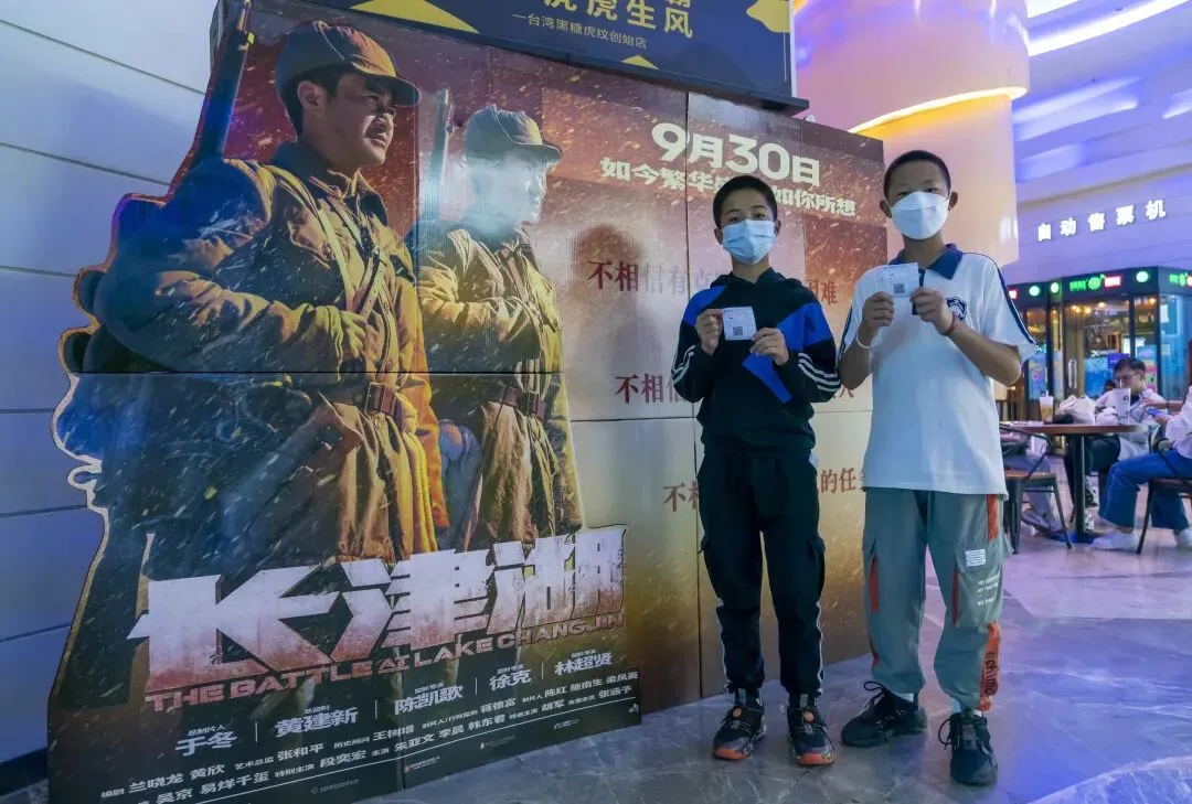 2021年10月1日,在昆明一家电影院,观众在电影《长津湖》展板前合影。