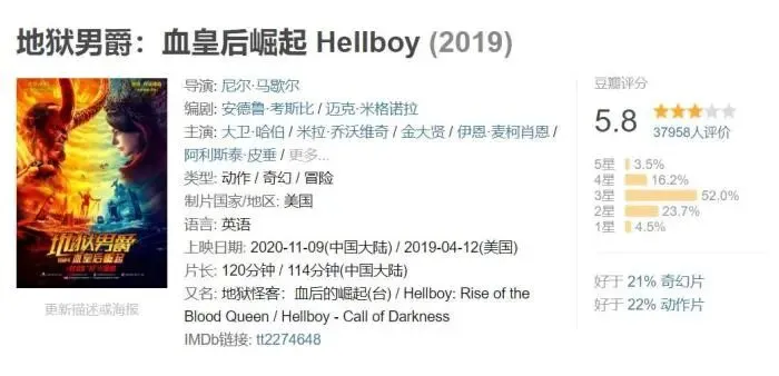 《地狱男爵:血皇后崛起》豆瓣评分截图。
