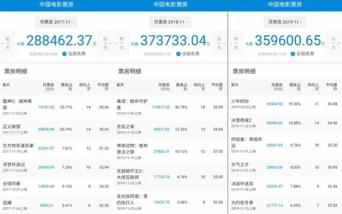 回顾往年,进口大片在11月的电影票房中占据了较高的份额。例如2019年的《冰雪奇缘2》《终结者:黑暗命运》《天气之子》,2018年的《毒液:致命守护者》《神奇动物:格林德沃之罪》《无敌破坏王2:大闹互联网》,以及2017年的《雷神3:诸神黄昏》《正义联盟》《东方快车谋杀案》等,其中个别爆款影片创下了单片超10亿的票房。
