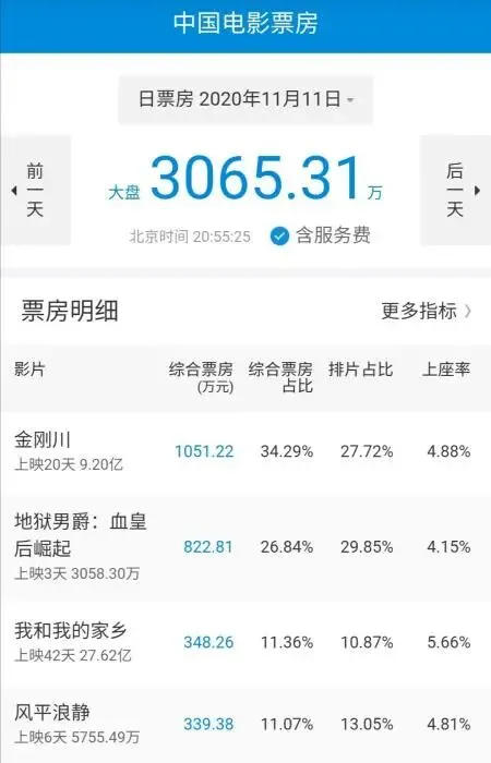 2020年11月11日的全国电影票房数据。来源:国家电影专资办。