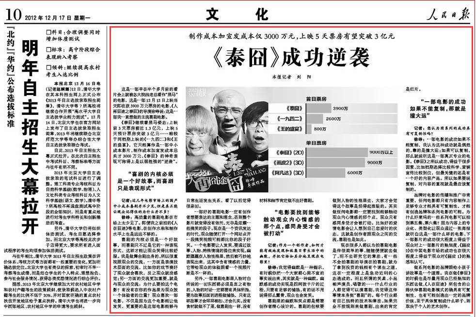 人民日报在12月17日(即该片上映的第5天)第十版文化板块发表文章《泰囧成功逆袭》: