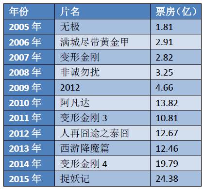 图:2005年-2015年内地票房排行第一影片