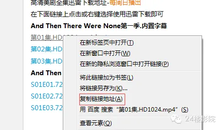 也有一种情况无法直接跳转至迅雷下载,这时需要【右击】链接,选择【复制链接地址】