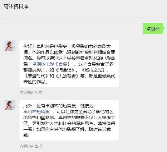 如想找单个电影,可直接发送电影名称,已配置好ai助理,会自动在资源库中匹配经典电影资源发送。以下为部分经典电影资源目录
