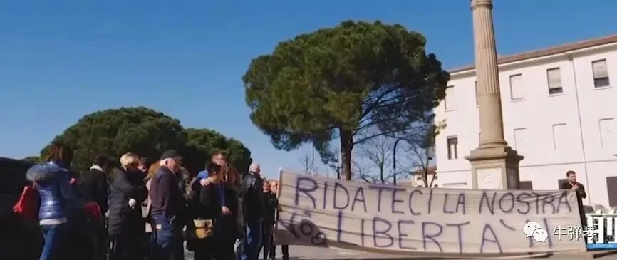 比如,按照政府的命令,疫情严重的伦巴第、威尼托等大区暂停一切集会和体育赛事,但就在威尼托大区的沃镇,前两天当地居民拒绝戴口罩,人们聚集在广场,手持横幅,要求政府“归还自由”。