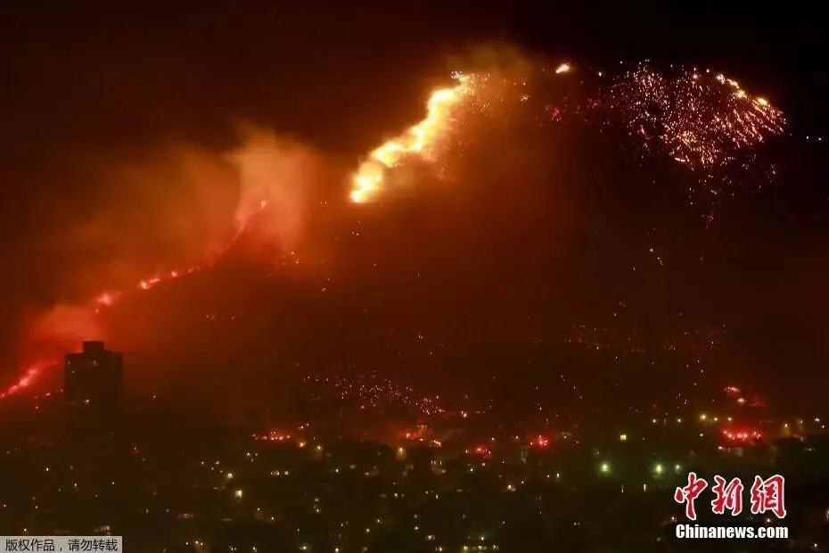 17日,南非开普敦山火持续肆虐。南非西开普省的山火已持续两周,造成多处建筑、农场被毁。