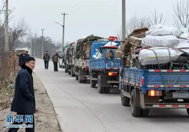 △ 1月16日,执法人员在一处生产假冒酱油的窝点查处的涉案物资装满了五辆货车。