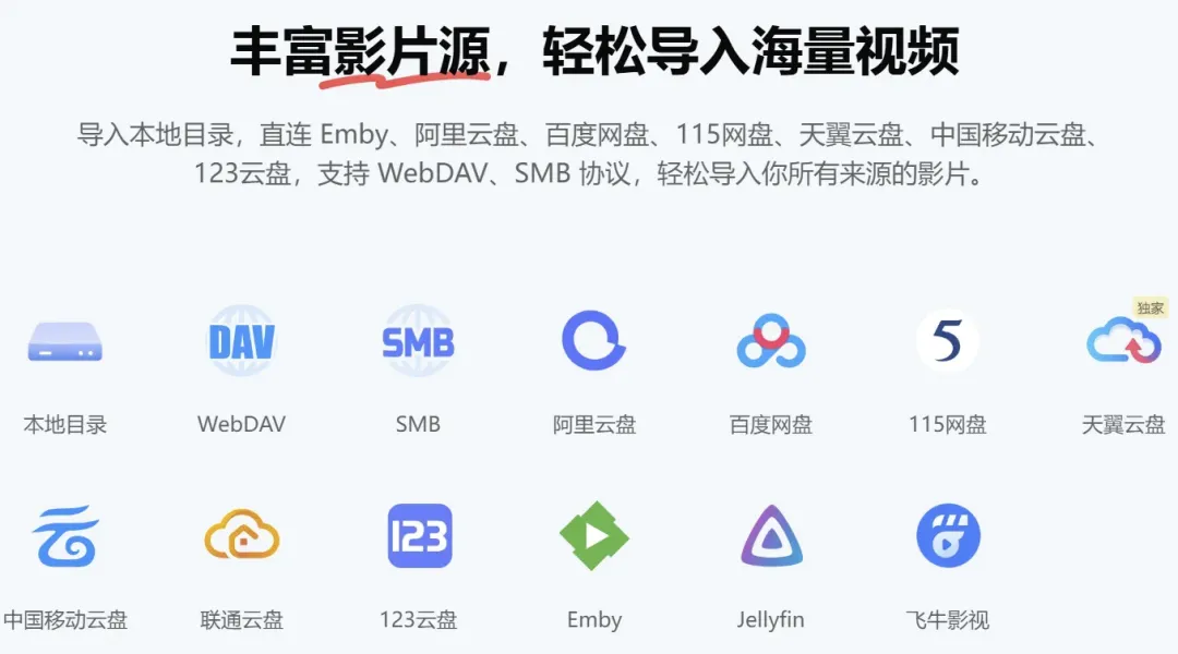 阿里云盘、百度网盘、115网盘、天翼云盘、123云盘等常用网盘,还可通过 WebDAV / SMB 等方式连接更多存储来源。