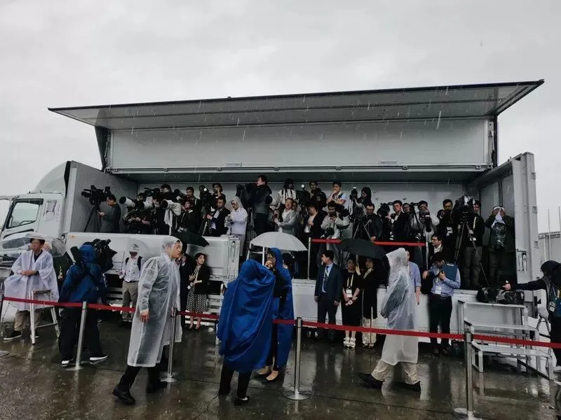 △27日上午,大阪,雨。等待报道习近平抵达大阪的记者。