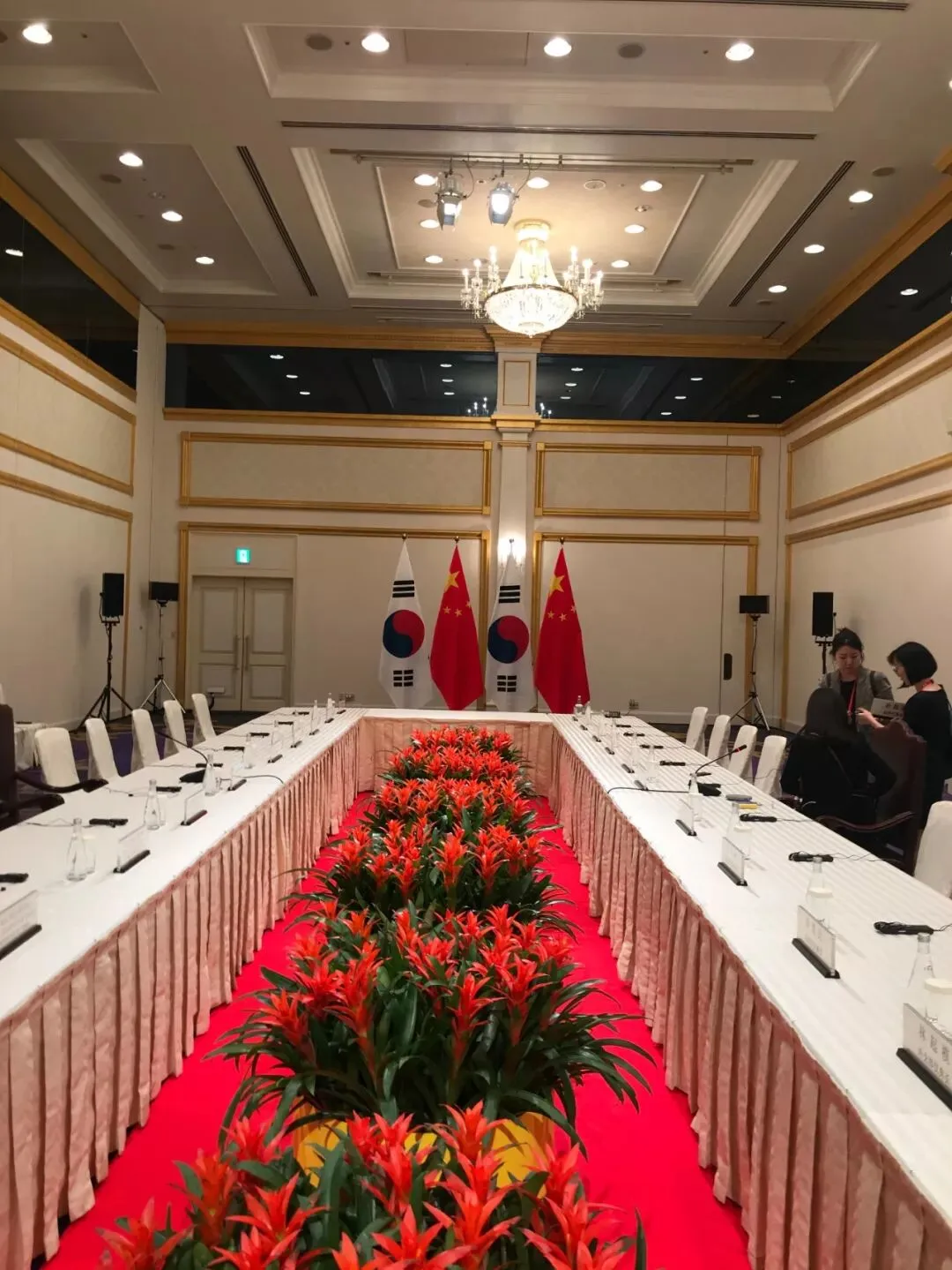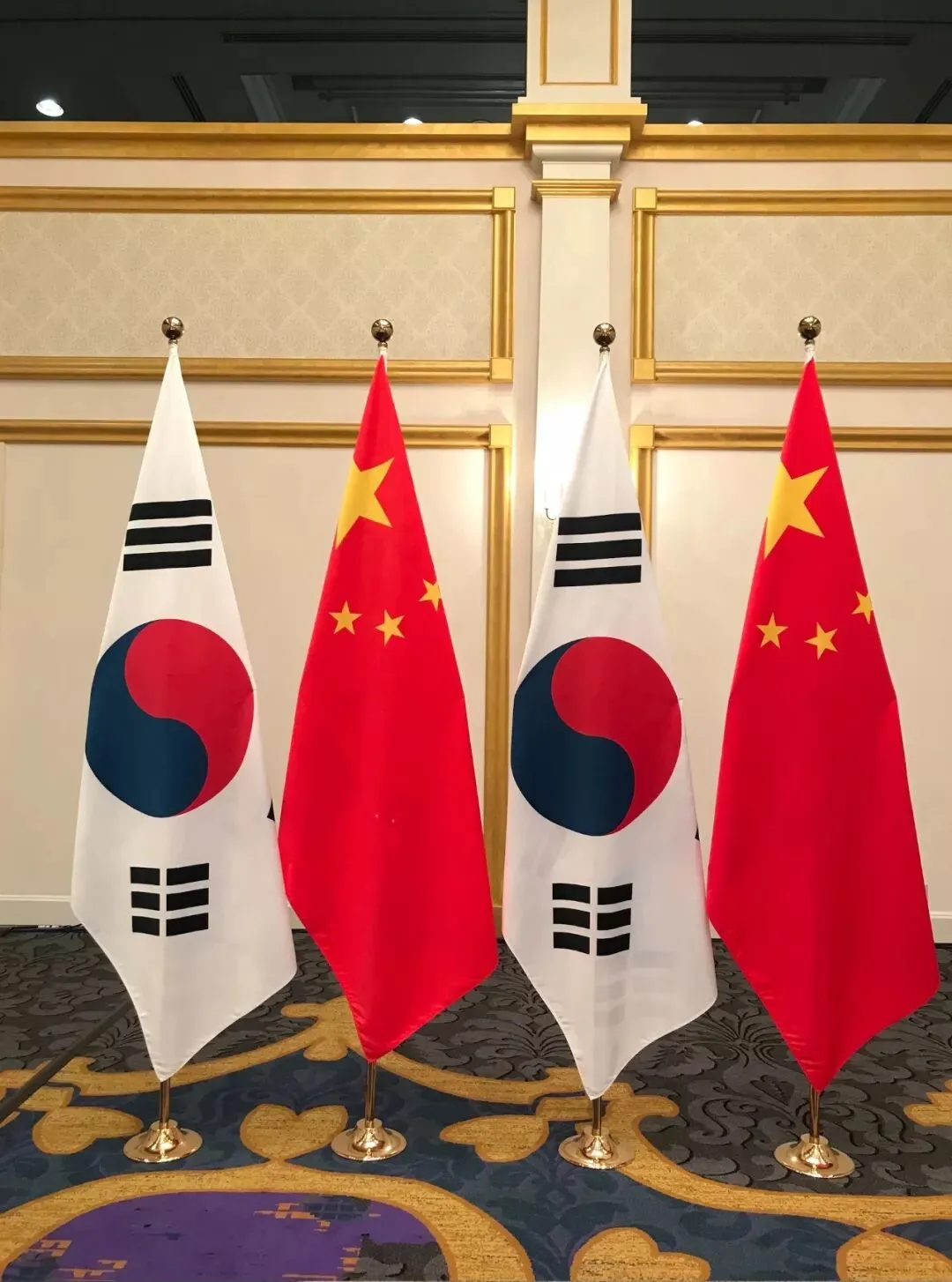 △会见现场的中韩两国国旗。(央视记者石伟明拍摄)