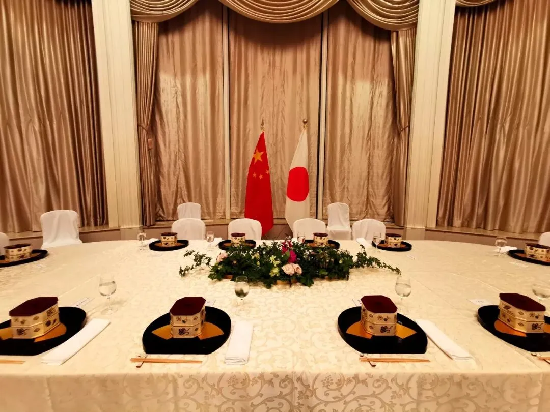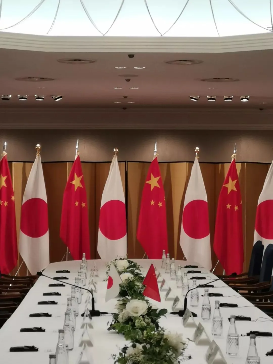 △会见现场的中日两国国旗。(央视记者杨立峰拍摄)