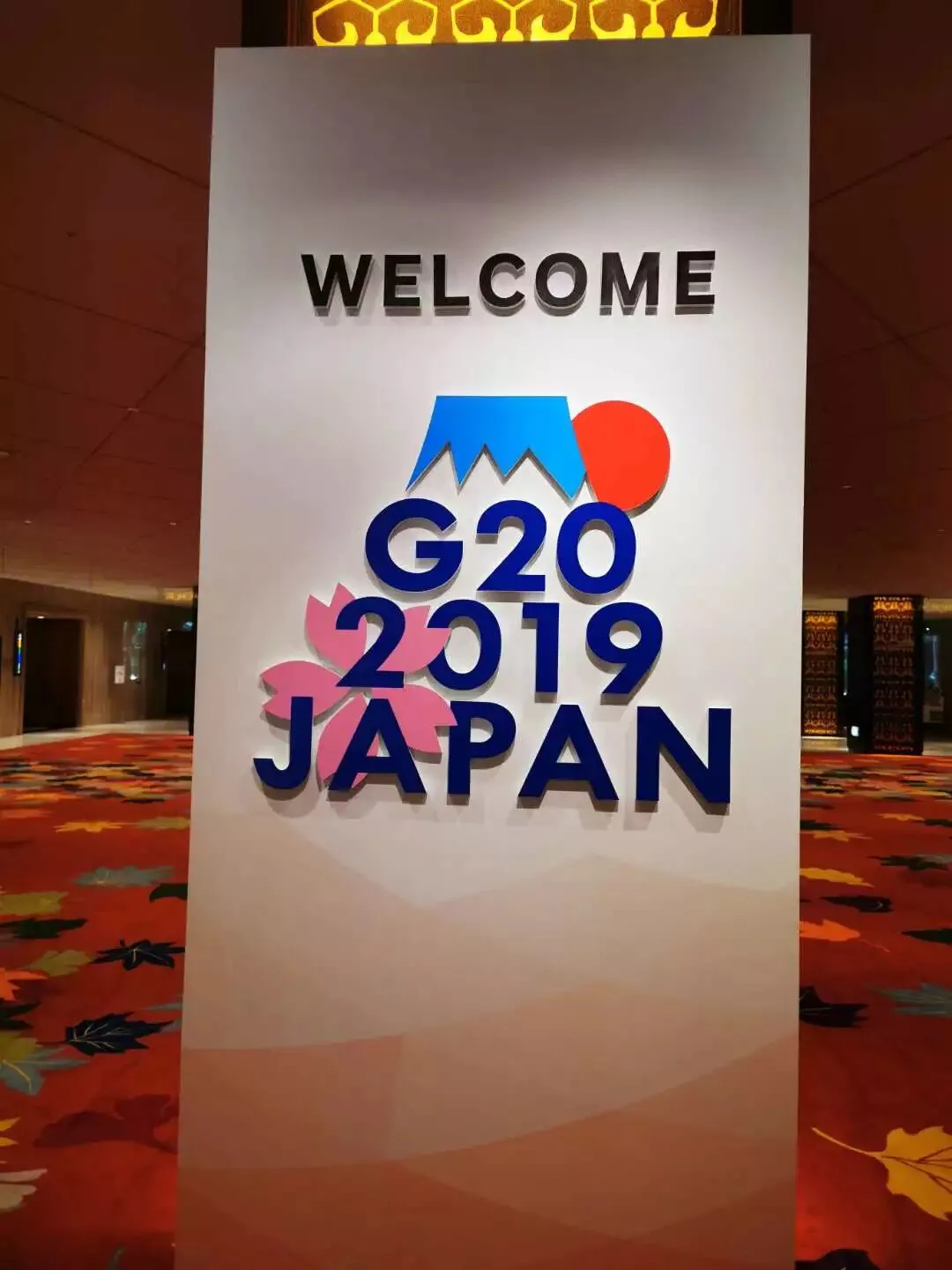 △G20峰会标志牌。标志由象征着日本的富士山、太阳和樱花等元素构成。富士山的“山顶”和“朝日”象征着增长和繁荣。山脚下,盛开的樱花代表着春天,寄托了人们对全球经济繁荣增长的美好期待。(央视记者荆伟拍摄)