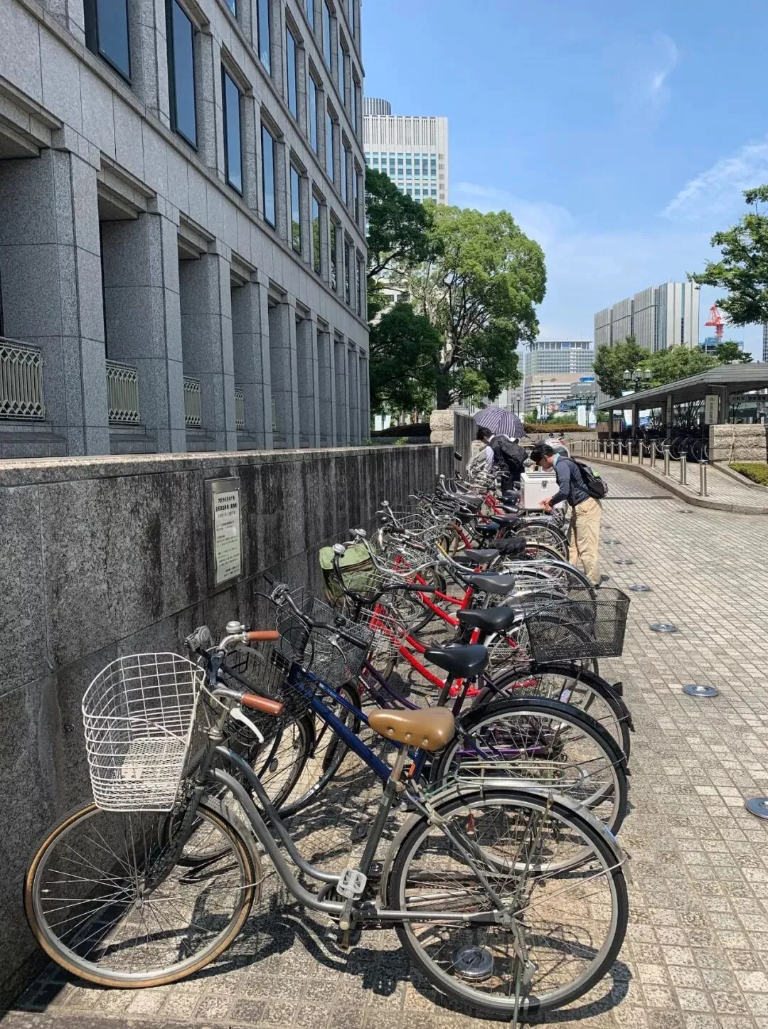 △在大阪市政府门口停放着的自行车。《时政新闻眼》发现,大阪很少见共享单车,基本都是自己所有。(央视记者沈忱拍摄)