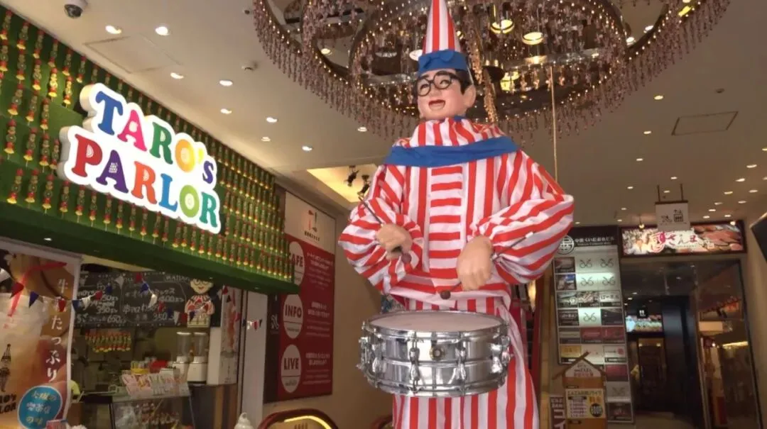 △道顿堀的小丑吉祥物名为“吃穷太郎”。之所以得名“吃穷太郎”,据说是大阪有太多好吃的东西,以至于食客们在不知不觉中,就把钱包给吃瘪了。(央视记者张怡提供)