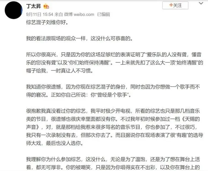 在丁太升和刘维的论战中,刘维提到这样一句话,当初接触综艺是为了温饱,现在不放弃综艺是因为他想在舞台上活着。而丁太升认为,刘维习惯了综艺咖的身份,老想着用综艺的方式去给作品“加分”,实则不得体的介入只会给作品减分。