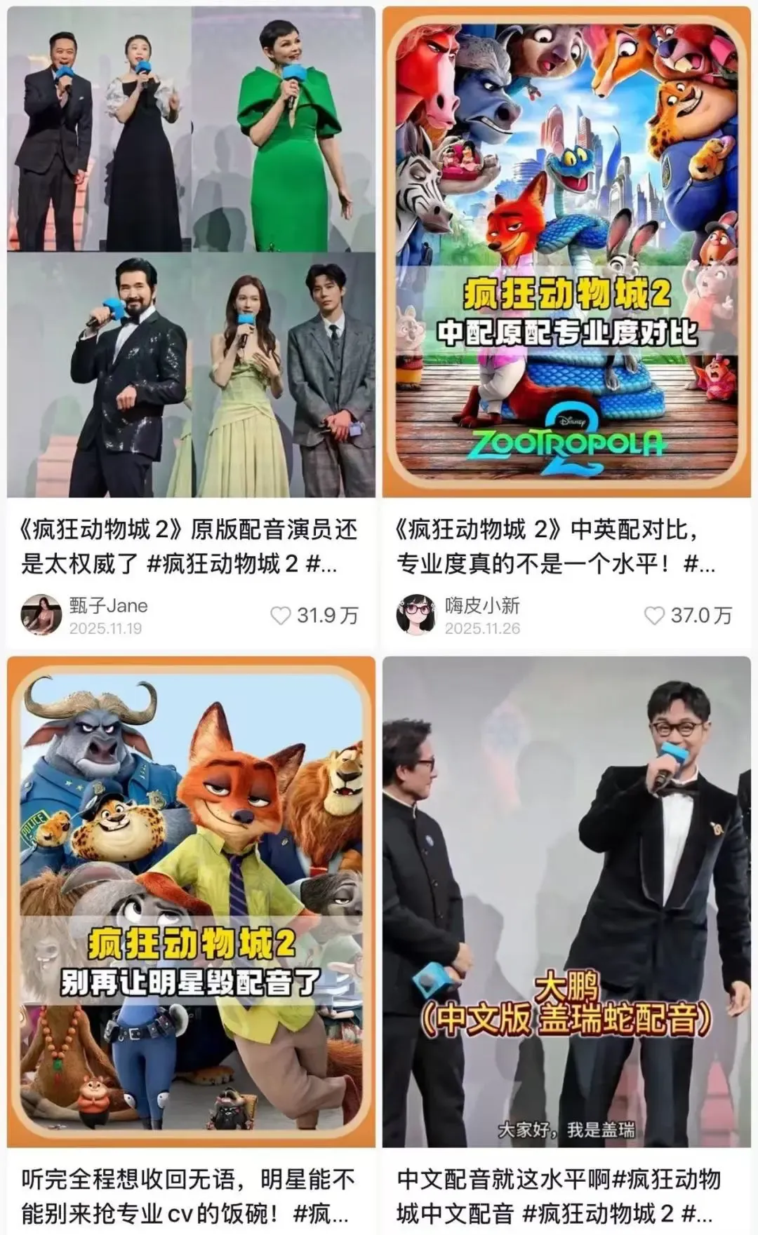 明星配音《疯狂动物城2》引发争议。(图片源于抖音)